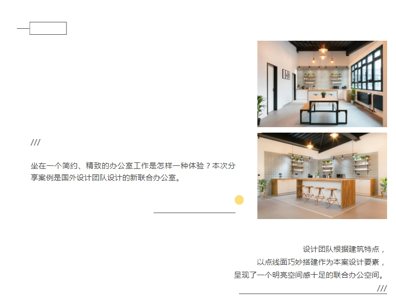 极简白色墙体搭配黑色框架,临窗会议室以透明玻璃为隔断,既提升了空间线条感和秩序感,又保留了建筑本身的特色。 小编认为本案设计给人耳目一新的原因之一,是灯光,复古三角灯罩+暖黄色灯光,空间温暖、祥和的氛围一下拉满 。这样的空间降低了职员工作的疲惫感,给予了员工更多的思想创意。 办公空间呈三角大棚状,工位分布在空间两侧临窗区域,中间复古沙发、桌椅让办公场地更多样,利于激发工作灵感和潜能。 茶水区位于空间的一侧角落,木色点缀,绿植充盈让这一空间充满了小清新的感觉。